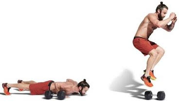 Faire un burpee sans le saut (allongé par terre, se relever) et sauter par dessus le dumbbell (ou objet qu’on utilise)
